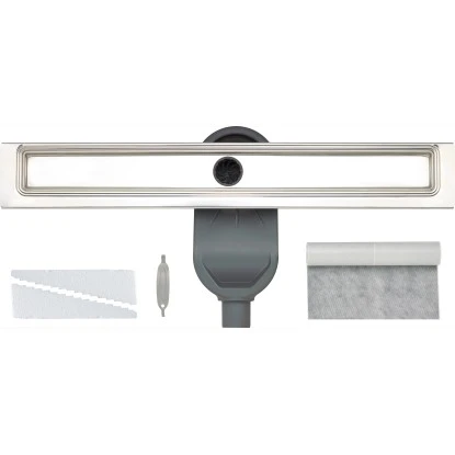 Die Duschrinne Alserio 70 cm dient als Ablauf für den befliesten Boden in der Dusche und ermöglicht barrierefreies Duschen. Durch den umlaufenden Fliesenflansch ist ein bündiges Fliesen möglich. Die Ablaufleistung entspricht 0,7 l pro Sekunde gemäß DIN EN 1253. Der vormontierte Geruchsverschluss schließ unangenheme Gerüche aus dem Ablauf aus. Eine stabile Höhenjustierung ermöglichen die beigefügten Hartschaumkeile. Das Duschrinnen-Designrost gehört nicht zum Lieferumfang und muss separat gekauft werden.