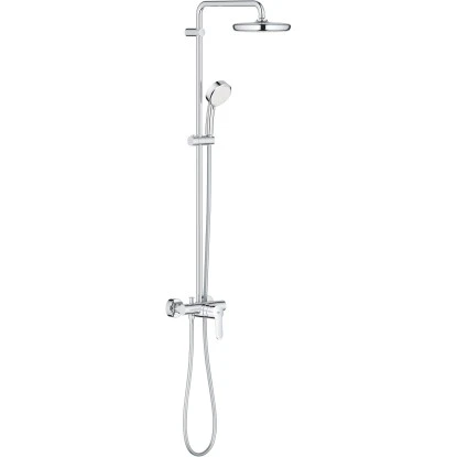 Die stilsichere Handbrause liegt gut in der Hand und lässt sich über ein Gleitelement in der Höhe verstellen. Dank Grohe DreamSpray erzeugt die Handbrause einen perfekt verteilten Wasserstrahl, der sehr angenehm auf die Haut wirkt. Dabei lässt sich die Brause besonders leicht von Kalk befreien. Durch das Antikalk-System SpeedClean lassen sich Kalkablagerungen an den Düsen einfach mit dem Finger abwischen. Gleiches gilt für die Kopfbrause. Das Duschsystem verfügt über zwei Strahlarten. Die Option Rain sorgt für ein angenehmes Sommerregengefühl. Der Jet-Strahl erzeugt einen festen massierenden Strahl. Für mehr Flexibilität sorgt der 390 mm lange Duscharm, der um 180° schwenkbar ist. Das Duschsystem wird erweitert durch einen Rotaflex Brauseschlauch mit einer Länge von 1.750 mm. Der TwistFree Brauseschlauch dreht sich immer mit Ihnen mit, so dass das Verdrehen des Brauseschlauches verhindert wird. So steht dem perfekten Duscherlebnis nichts mehr im Weg.