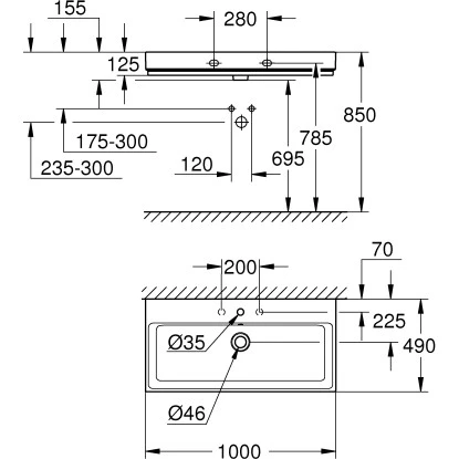 Für die Armatur ist bereits ein mittiges Hahnloch mit Ø 3,5 cm durchgestochen, zwei weitere sind vorgestochen und ermöglichen die Verwendung von Dreiloch-Armaturen. Ebenso vorbereitet ist der Ablauf mit Ø 4,6 cm. Die Montage fällt dementsprechend werkzeugarm aus.