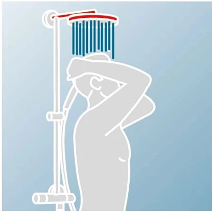 Die große, eckige Tellerkopfbrause simuliert eine angenehme Regendusche und lädt zum Entspannen ein, während die klassische Handbrause höhenverstellbar ist. Die Bedienung gelingt ganz einfach über Drücken oder Drehen der Elemente. Darüber hinaus bietet die praktische, integrierte Ablage ausreichend Platz für Ihre Dusch- und Pflegeprodukte, sodass Sie diese stets griffbereit haben. Der Korpus besteht aus Messing mit verchromter Oberfläche.