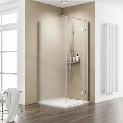 Die Schulte Master Class Drehtür wird mit formschönen, halbkreisförmigen Scharnieren an einem schmalen, feststehenden Seitenelement befestigt.